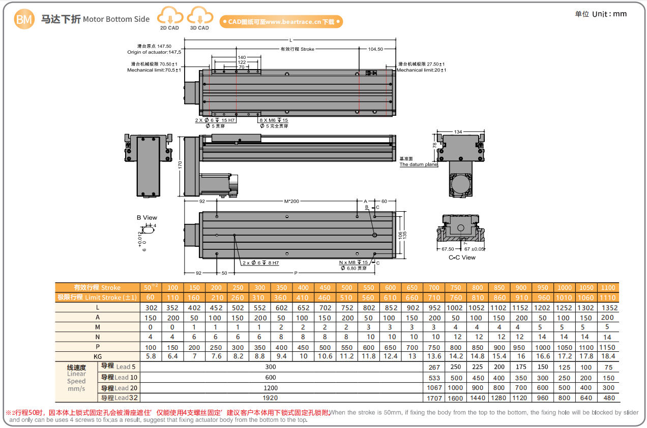 标准行程:50~1100mm